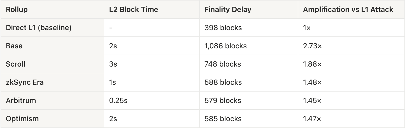 By flooding the L2 with spam instead of attacking Ethereum directly, attackers can delay when transactions finalize by 1.45×–2.73× longer.