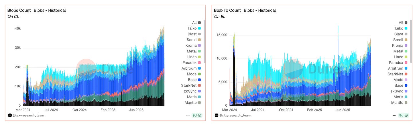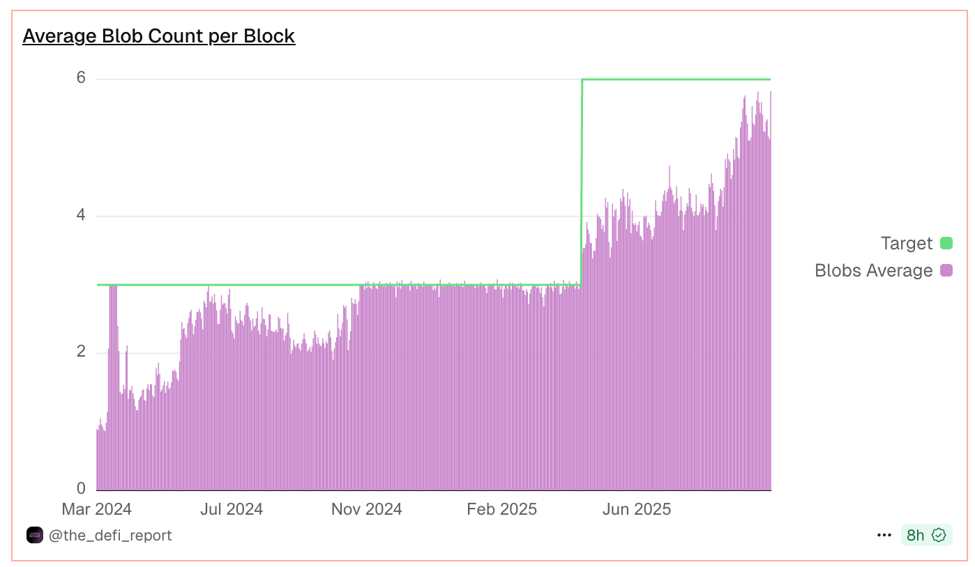 Then came Pectra in May 2025, which doubled blob capacity, increasing the target from 3 blobs per block to 6, and raising the maximum to 9.