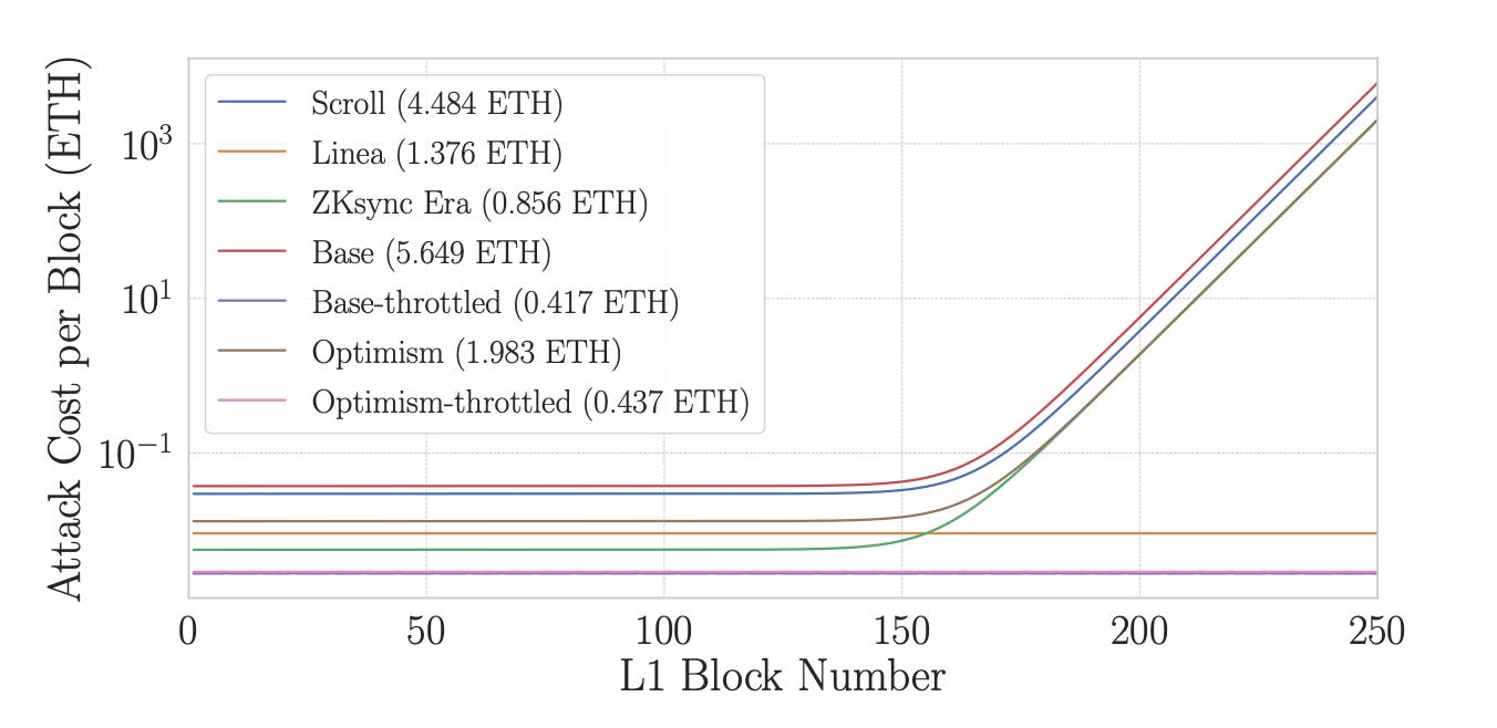 Why it’s devastatingly cheap: When blob usage is below Ethereum’s target (common post-Pectra), blob base fees can drop to 1 wei per byte, essentially free. The paper shows periodic DoS costs under 2 ETH for 30 minutes on most rollups. But sustained DoS is even cheaper: 0.87 ETH per hour on Linea, 0.8 ETH/hour on Optimism (throttled), and 2.7 ETH/hour on Base (throttled), indefinitely.