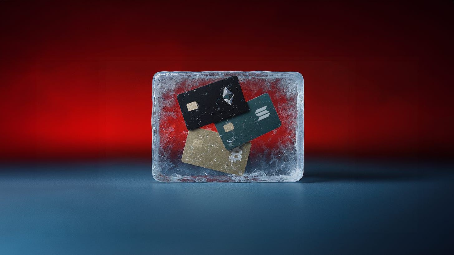 Same with crypto cards: yes, you can deposit crypto and your card will convert it to fiat so you can pay, but centralization and permissioned access are still issues.