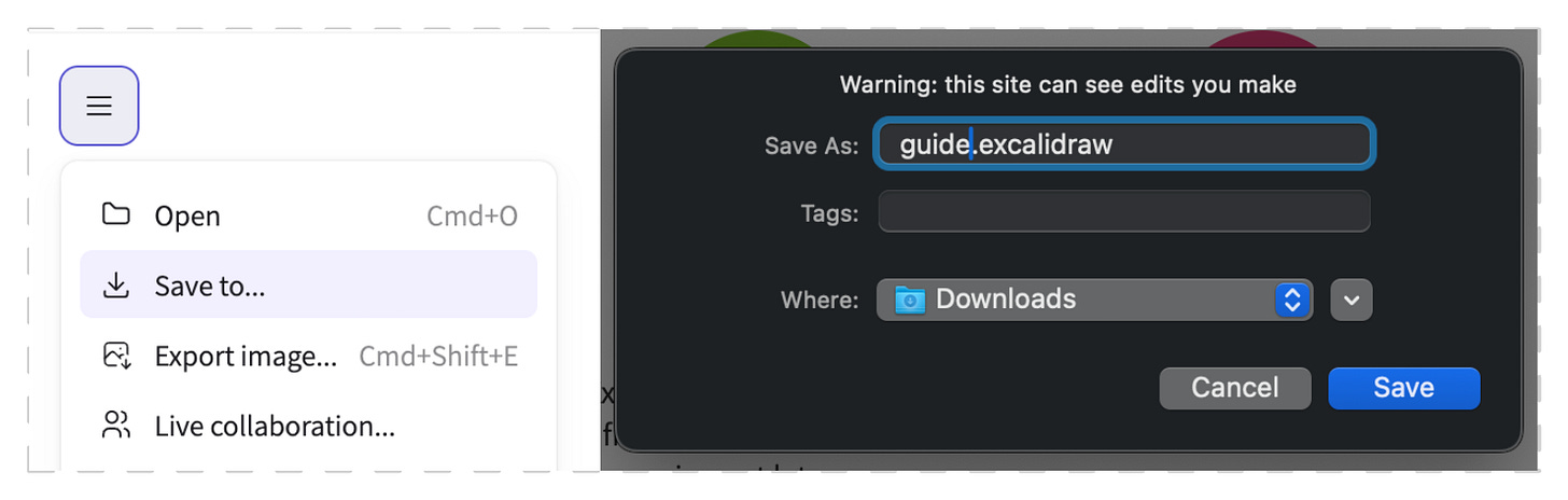 When you've finished exporting your diagram or haven't finished yet, you can save your .excalidraw file locally. This ensures it's always accessible for editing, especially if you're working on multiple diagrams at once. Saving the file allows you to restore your previous work.