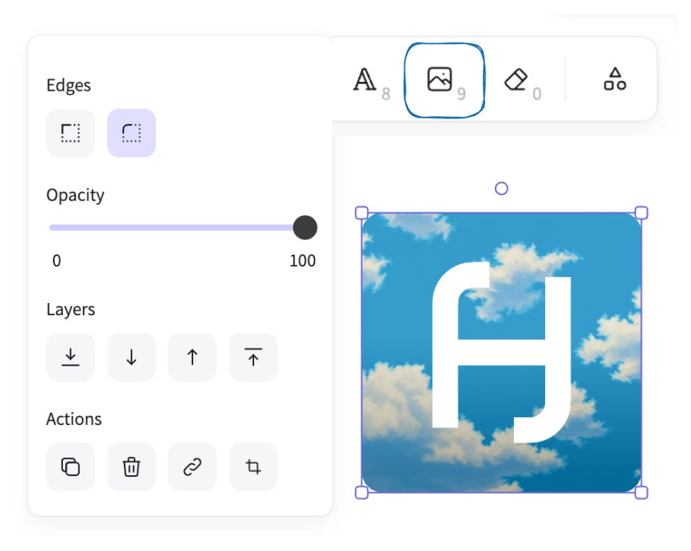 You can upload external images to your canvas using the image button or by copying them from another page. The only customizable features are opacity and edges. Most of the time, rounded edges look nicer, so you should choose those.