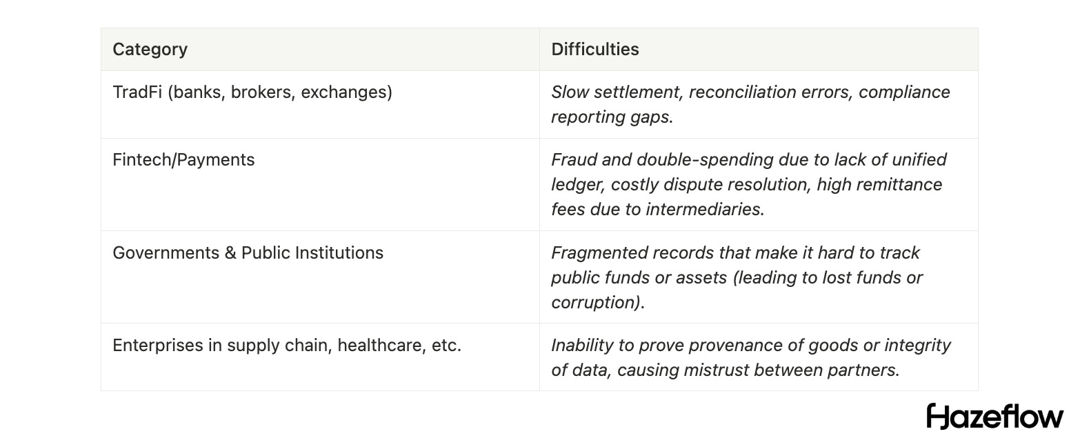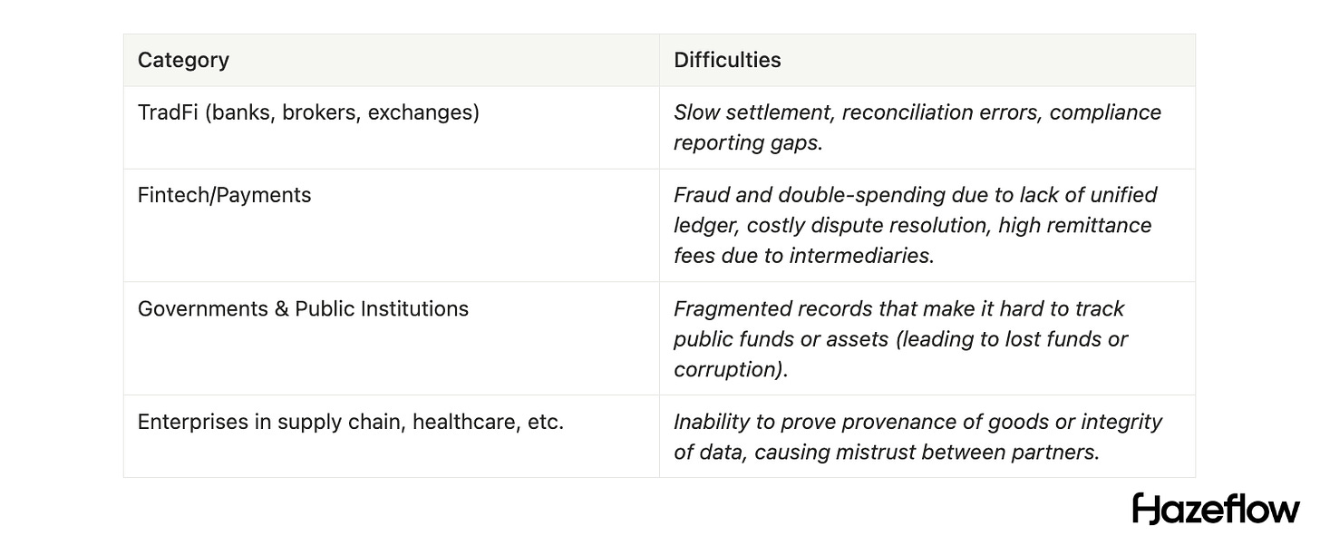 Institutions carry a lot of legacy. They deal with outdated core systems that may cause transaction errors → fintechs and payment processors grapple with fraud and data mismatches across partners → supply chains see goods “disappearing” due to siloed databases.