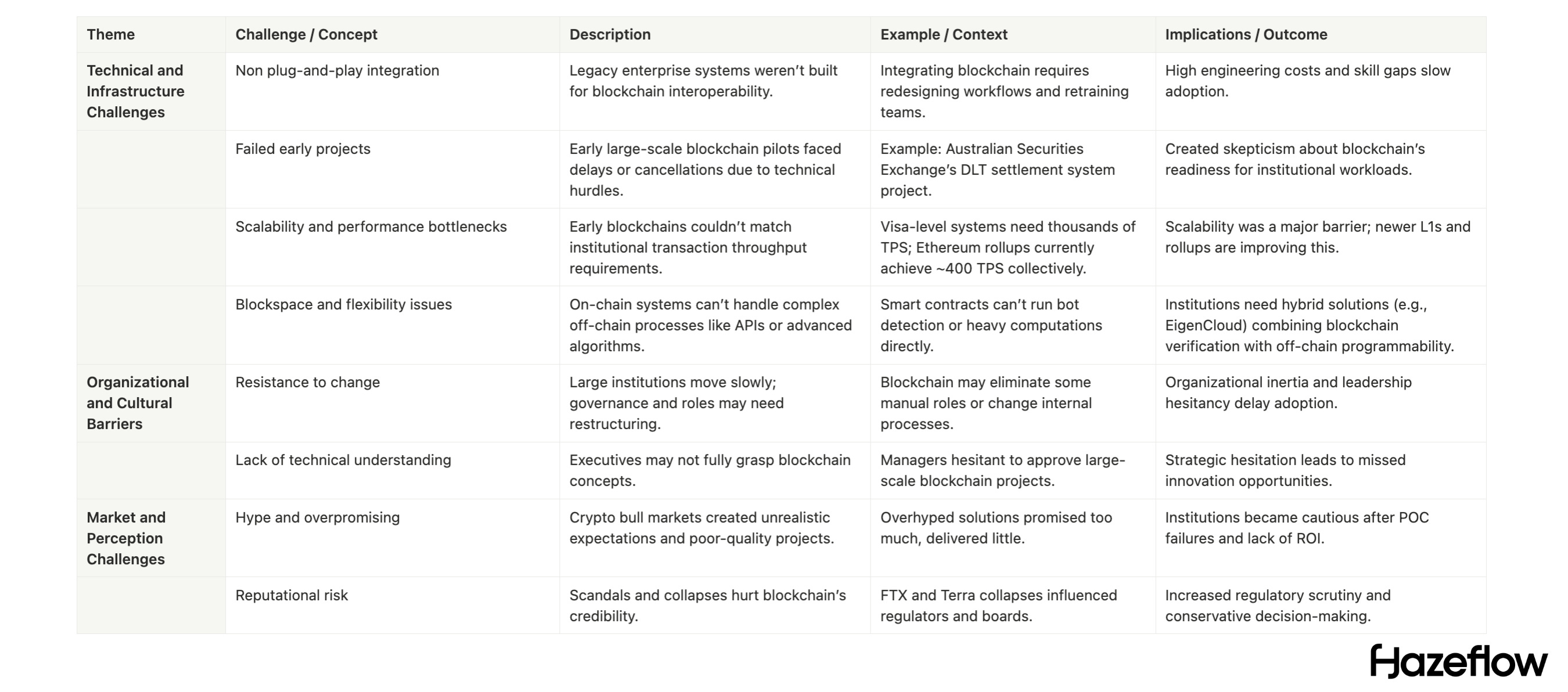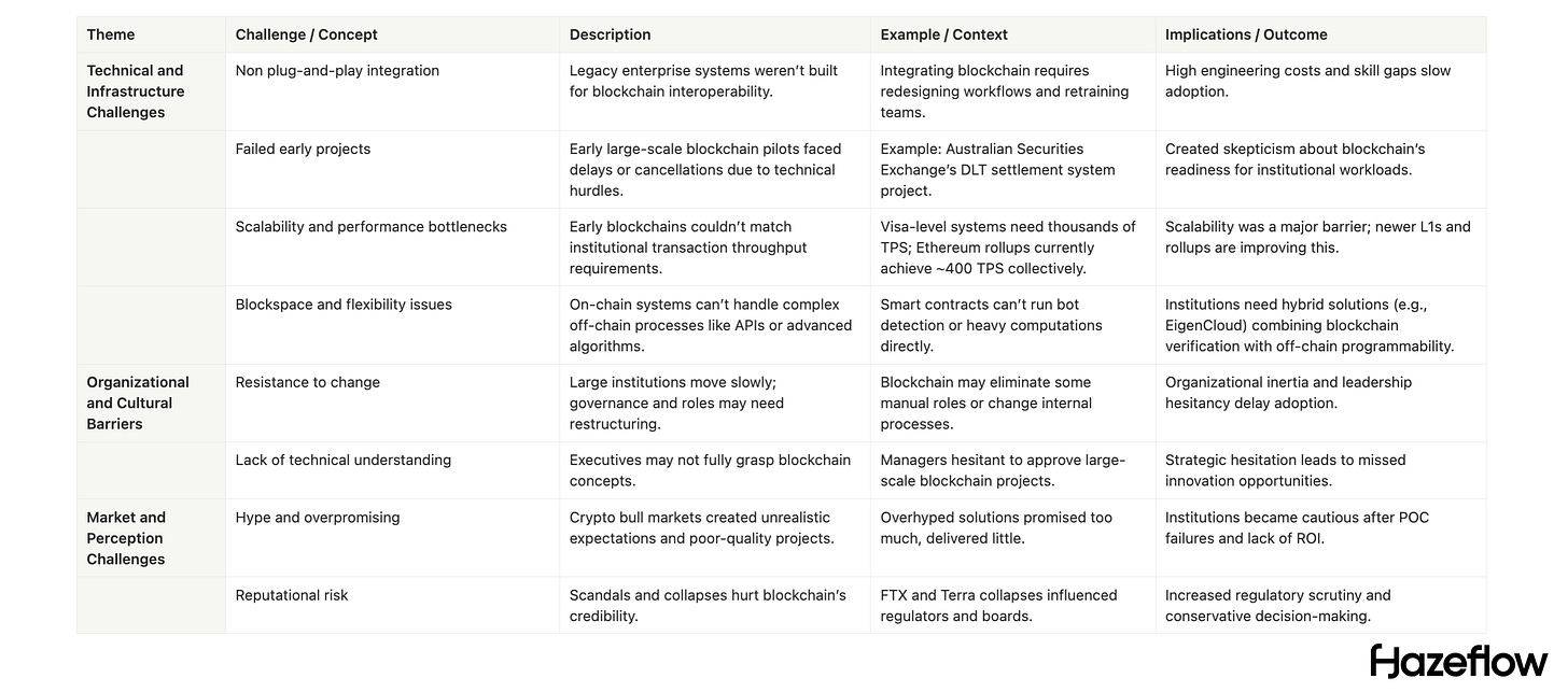 Adoption is hampered by “over-promised benefits” and “under-delivered business value.” Many organizations grew wary after proofs of concept failed to show immediate improvements. The crypto bubble and bust cycles also played a role; headlines about scams or collapsed crypto firms (FTX, Terra) further made boards and regulators cautious. So even if verifiability sounded good, decision-makers weren’t ready to overhaul systems without clearer, proven cases; they didn’t want to be beta-testers of overhyped tech.