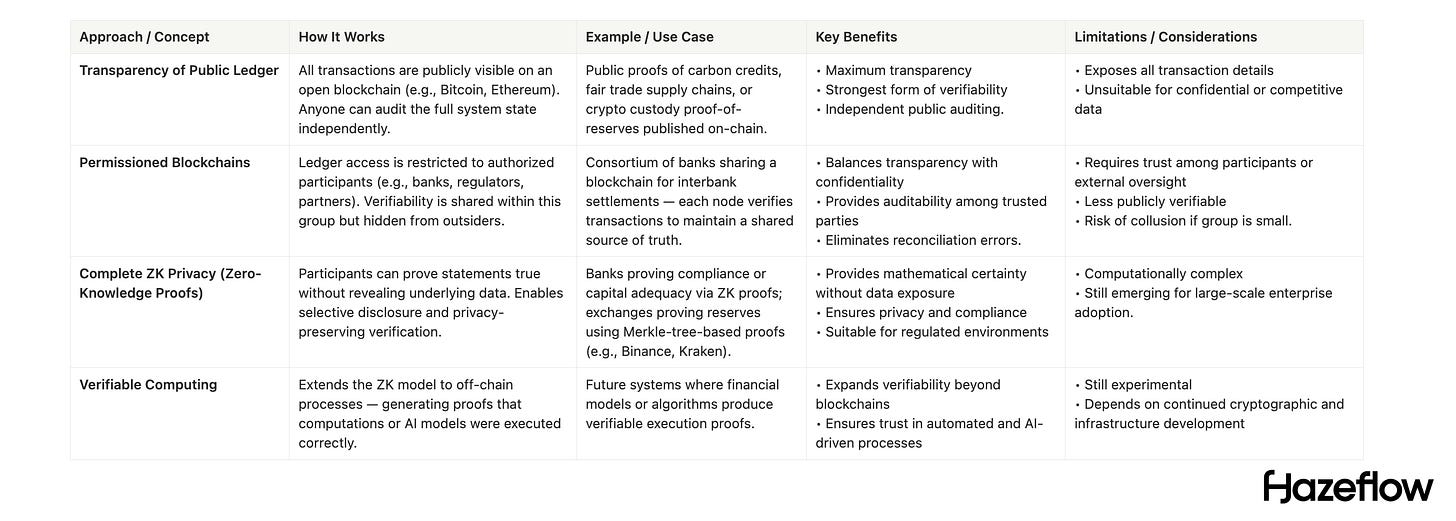 In practice, solutions often mix these approaches. A permissioned network might publish periodic zk proofs to regulators, while a public chain might use encryption and zk proofs to hide sensitive data yet allow selective verification. Verifiability lies on a spectrum: from fully transparent ledgers to cryptographically verifiable but opaque ones. Institutions can choose the mix that suits their risk, regulatory, and business needs.
