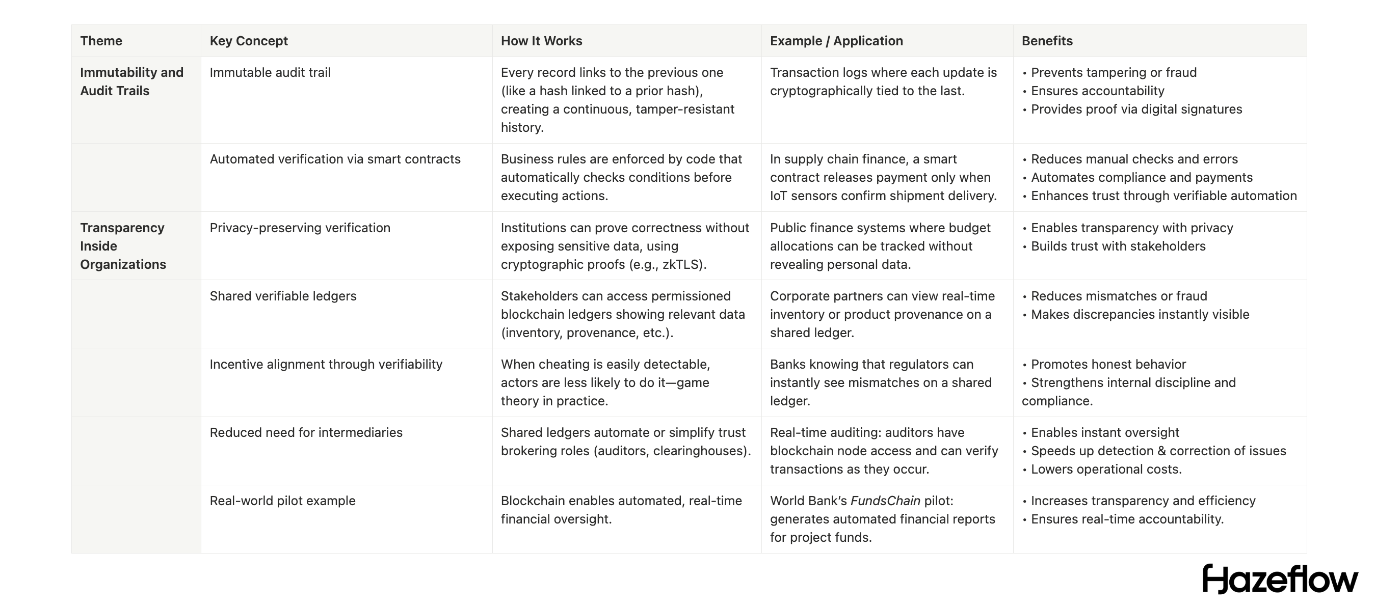 In many institutional processes, multiple middlemen exist to broker trust (clearinghouses, auditors, etc.). Verifiable ledgers can reduce the need for some of these, or make their jobs easier. Real-time auditing becomes possible: instead of waiting for quarterly reports, an auditor could have node access to the company’s blockchain system and observe transactions as they happen (or at least get cryptographic proofs of them). One World Bank pilot, FundsChain, is using blockchain to produce automated financial reports for project funds in real time. This kind of instant oversight means problems are caught and corrected sooner.