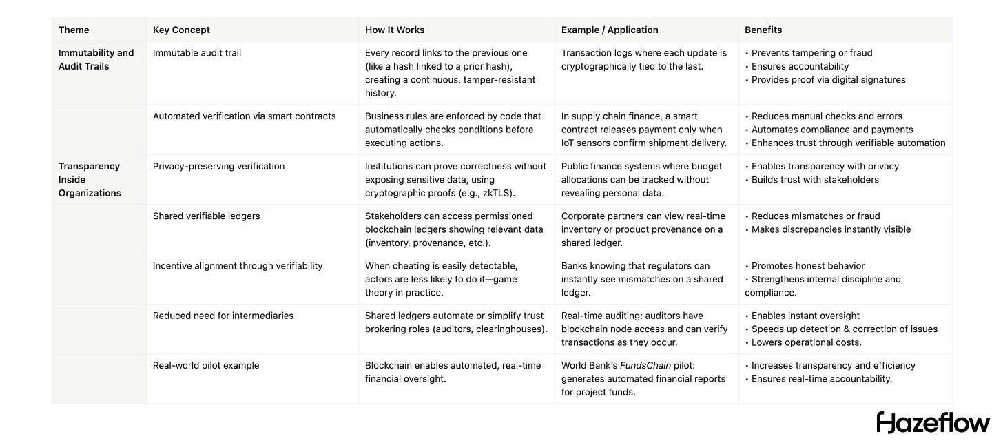 Institutions can prove to others that they are acting correctly without revealing sensitive data (privacy-preserving protocols and zkTLS-style of verification).