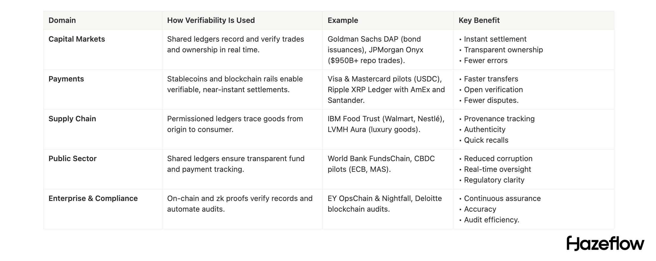 Another example is CBDC pilots: projects like those by the European Central Bank or Monetary Authority of Singapore have explored distributed ledger technology for interbank payments. A key motivation is that regulators could gain a verifiable view of all transactions in the system (with privacy protections in place). While most CBDCs are still in the R&D phase, the verifiability aspect is what makes the difference.