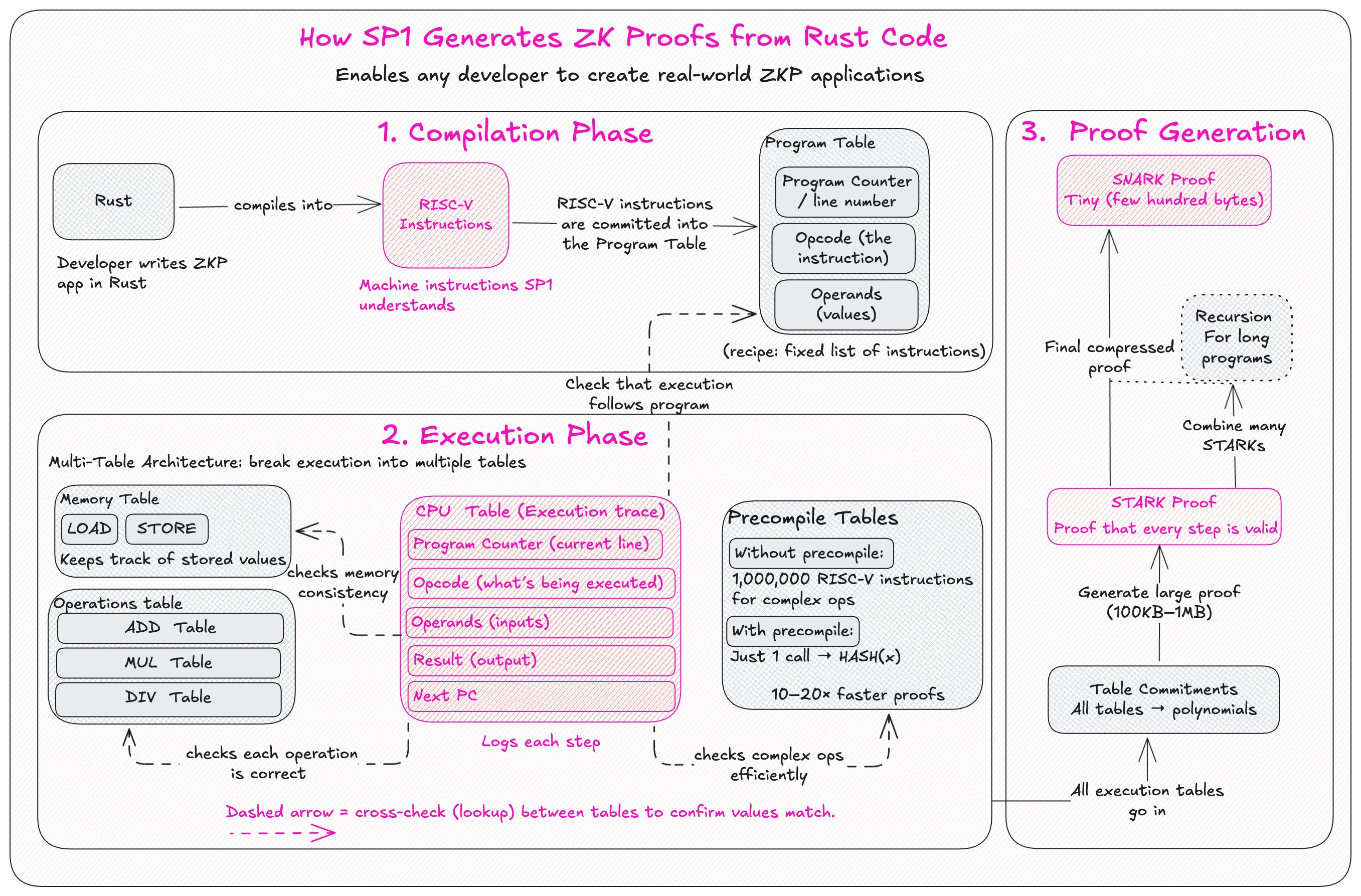 SP1 solves the software side of proving: you write normal Rust code, it compiles to RISC-V, and SP1 produces the ZK proof.