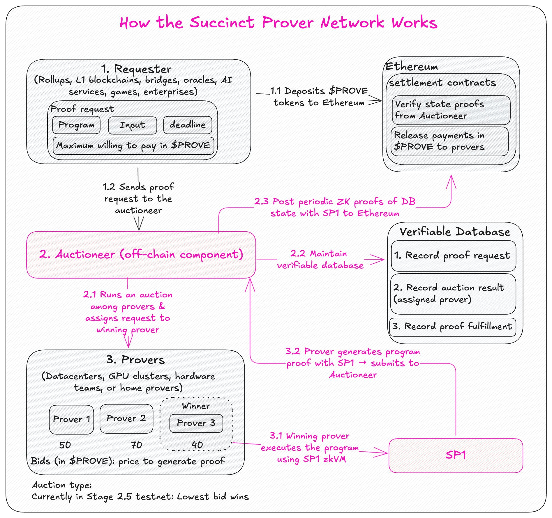 A requester deposits $PROVE on Ethereum and submits a proof request.