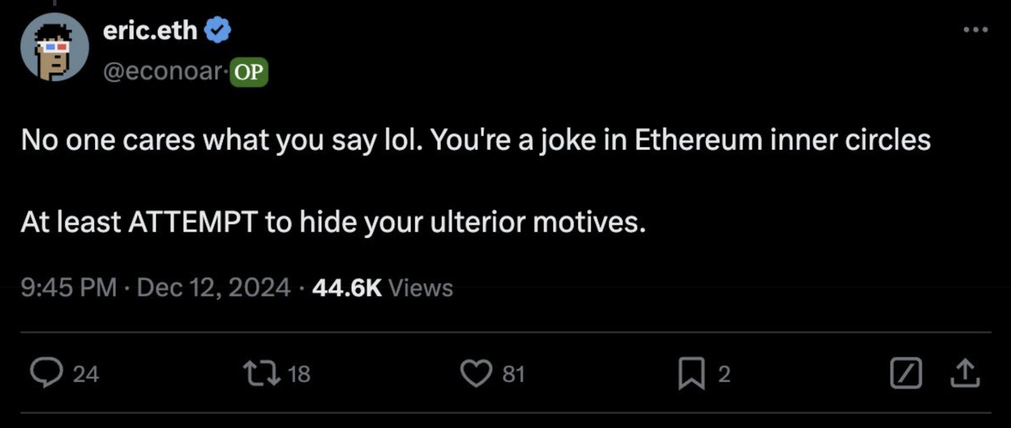 Poor guys making peanuts in the EF (compared to FAANG companies and AI research labs) got hate because they’re making money and helping a protocol that is not Ethereum, but the separate protocol that wanted to make Ethereum better.