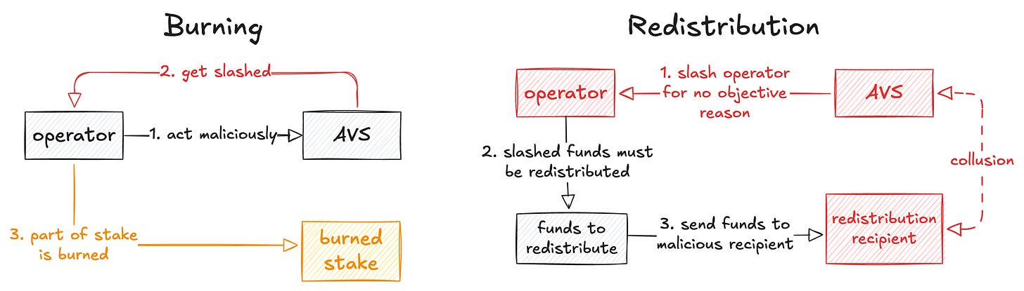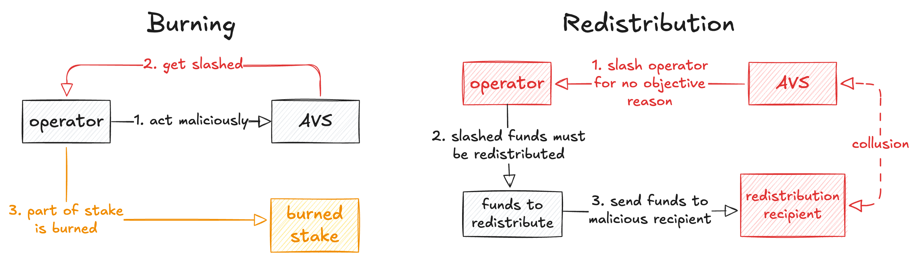 With redistribution, an AVS can drain one operator’s stake to a malicious one (they work together) to basically extract value from the system. The same thing happens if AVS keys are compromised, which can also affect the overall “attractiveness” of operators or AVSs.
