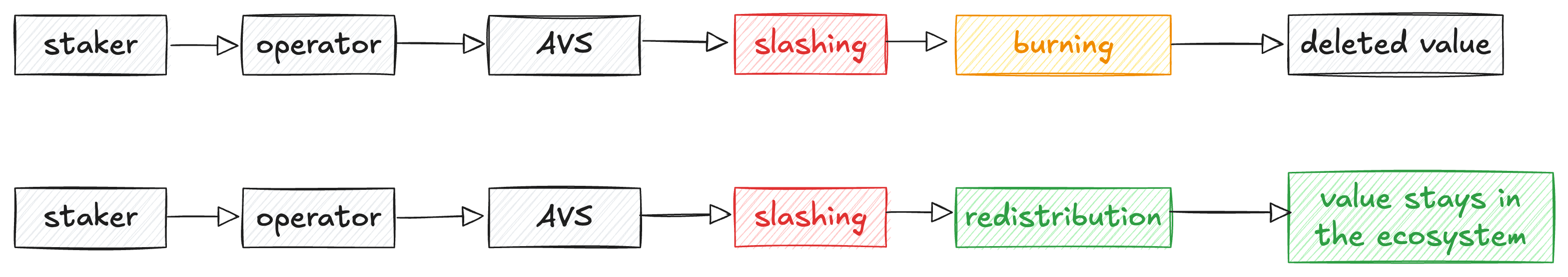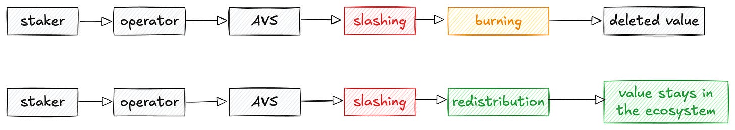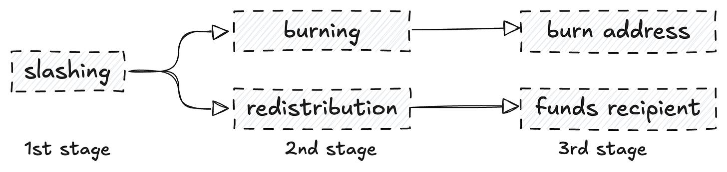 When slashing is the initial stage of punishing malicious behavior, redistributing the assets is usually a more efficient option than simply burning them.